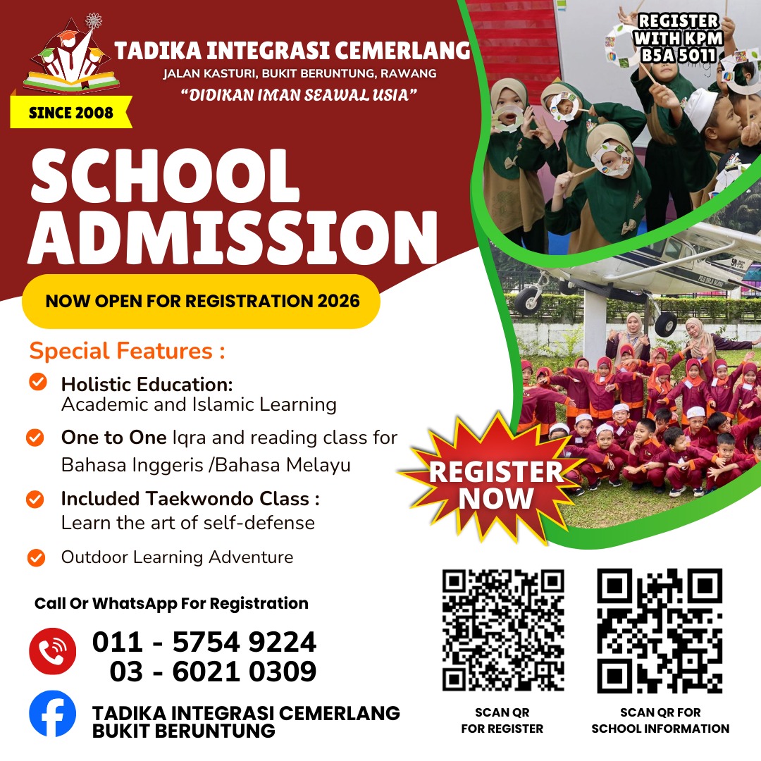 Established in 2008, Tadika Integrasi Cemerlang continues to provide a balanced education that nurtures both academic excellence and Islamic values. Our early learning environment encourages curiosity, creativity, and strong character development among young learners.